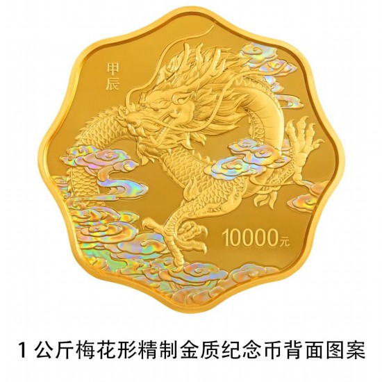 背面图案共12幅,均刊“甲辰”字样及面额。其中,10公斤圆形金质纪念币背面图案为龙造型,衬以祥云组合设计。