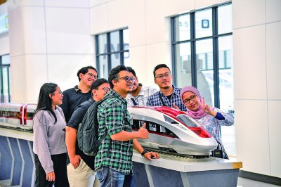 11月17日,在印度尼西亚雅加达的雅万高铁哈利姆站候车大厅,人们和一个雅万高铁高速动车组模型合影。 新华社发